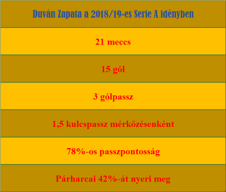 Tudva lévő volt, hogy Zapata remek képességekkel bír, elvégre az előző két idényt is 10 gól felett zárta, de az idei szereplése minden eddigin túl tesz. 29 mérkőzésen 20 gólnál és 5 gólpassznál tart a kék-feketék dresszében. Átlagosan 80 percenként van köze egy gólhoz. Az idénykezdése nem volt túl fényes, de az utóbbi időben fergeteges amit a pályán művel. Legutóbb az Empoli elleni idegenbeli bajnokin nem talált be, azóta zsinórban 10 mérkőzésen volt legalább egyszer eredményes. Korábbi csapata, az Udinese ellen mesterhármast lőtt, a Lazio ellen győztes gólt szerzett a Juventus elleni duplájának köszönhetően pedig pontot szerzett az Atalanta. A 2019-es naptári évben a Frosinone ellen 4 gólt vágott, a Roma elleni gólja pedig pontot ért csapatának. Legutóbb, tegnap a Coppa Itáliában nyújtott extrát. A negyeddöntős ellenfél a Juventus volt, Zapata két gól szerzett, így neki is köszönhetően kiejtették a címvédőt.